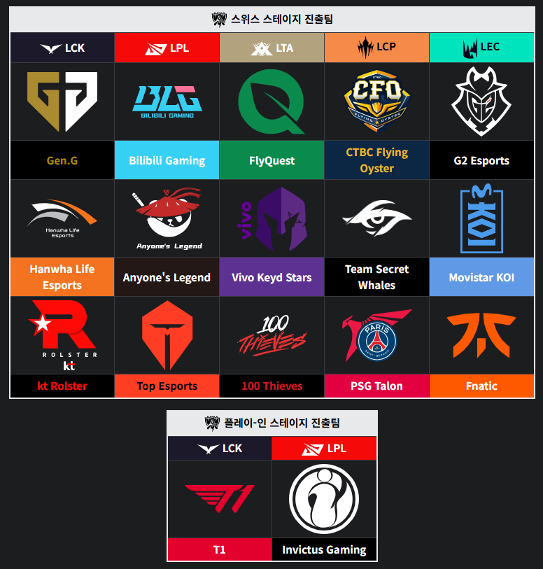 | 플레이-인 | 10월 14일 | 베이징 스마트 이스포츠 센터 | LCK vs LPL 4시드 대결 |
